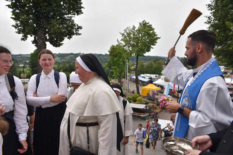 Tuż przed wejściem do sanktuarium Matki Bożej Tuchowskiej trzeba było jeszcze pokonać strome schody. 30-stopniowy upał chłodzili ojcowie redemptoryści wodą święconą, którą hojnie kropili pielgrzymów.