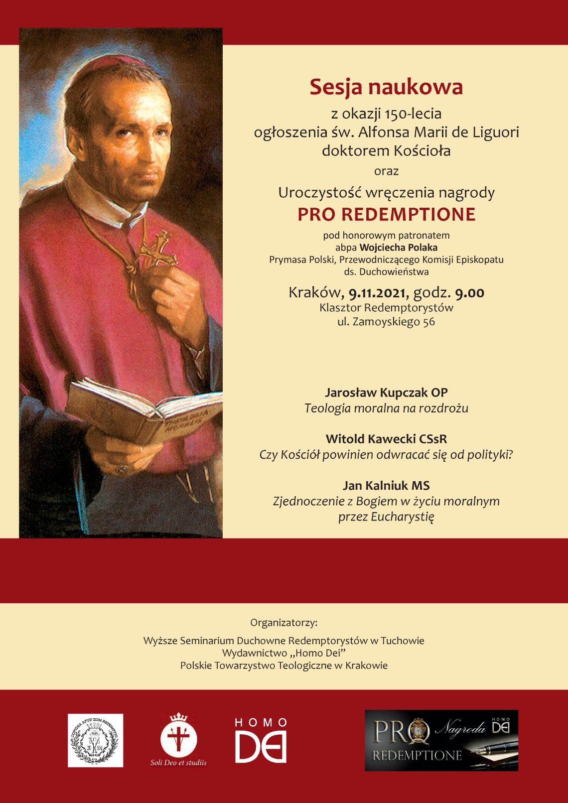 Zapraszamy na sesję naukową z okazji 150-lecia ogłoszenia św. Alfonsa Marii de Liguori doktorem Kościoła oraz uroczystość wręczenia nagrody PRO REDEMPTIONE 2021 pod honorowym patronatem ks. abpa Wojciecha Polaka, Prymasa Polski, Przewodniczącego Komisji KEP ds. Duchowieństwa.