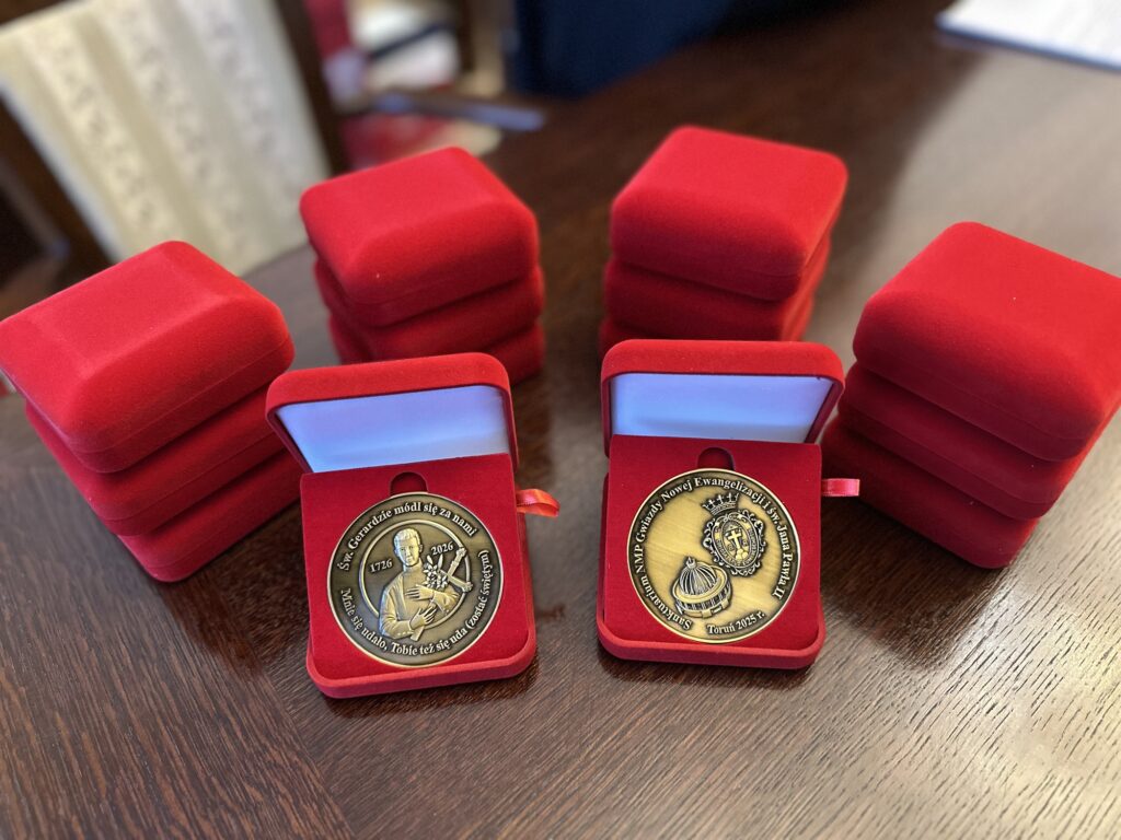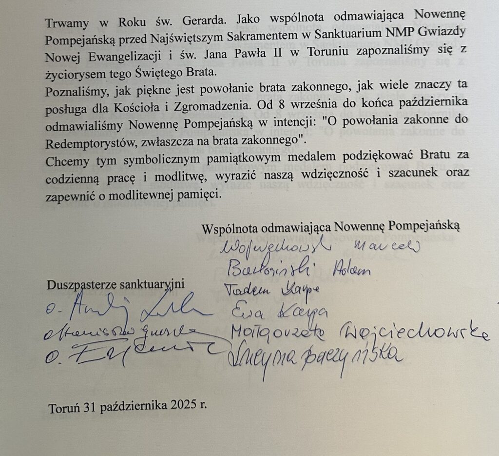 Wspólnota Matki Bożej Pompejańskiej przy sanktuarium NMP Gwiazdy Nowej Ewangelizacji i św. Jana Pawła II w Toruniu po zapoznaniu się z postacią św. Gerarda Majelli, którego 300-lecie urodzin obchodzimy (1726-2026), oraz nowennie pompejańskiej w int. powołań zakonnych postanowiła uhonorować pamiątkowym medalem Roku Św. Gerarda braci zakonnych redemptorystów.