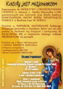 Nie każdy oczywiście pojedzie w najdalsze zakątki świata, aby dotrzeć do ludzi potrzebujących orędzia zbawienia. Jednak każdy może odpowiedzieć na wezwanie papieża Franciszka do wyjścia na peryferie. Wspólnie ze świeckimi współpracownikami, jako Redemptorystowskie Stowarzyszenie Przyjaciół Misji, wspomożemy naszych Współbraci, którzy pracują na misjach zagranicznych, organizując kolejny, już dziesiąty, Jarmark z Aniołami. Podczas tego wydarzenia będziemy zbierać środki na wsparcie o. Marka Marszałka CSsR, prowadzącego budowę sanktuarium Matki Bożej Nieustającej Pomocy w Burkina Faso.